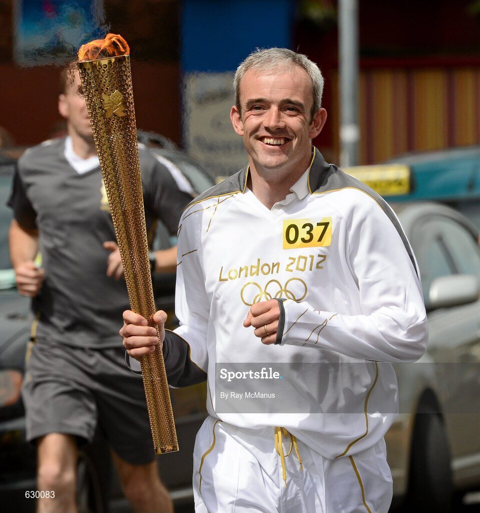 6 June 2012; Torchbearer Ruby Walsh, from Co. Kildare, is Ireland’s most celebrated jump jockey and a legend in National Hunt racing. With over 1,900 winners in a star-studded career to date, Ruby continues to win honours in Britain and Ireland and is a superb ambassador for the sport and his country, with the Olympic Flame during the London 2012 Olympic Torch Relay through the streets of Dublin. Nassau Street, Dublin. Picture credit: Ray McManus / SPORTSFILE