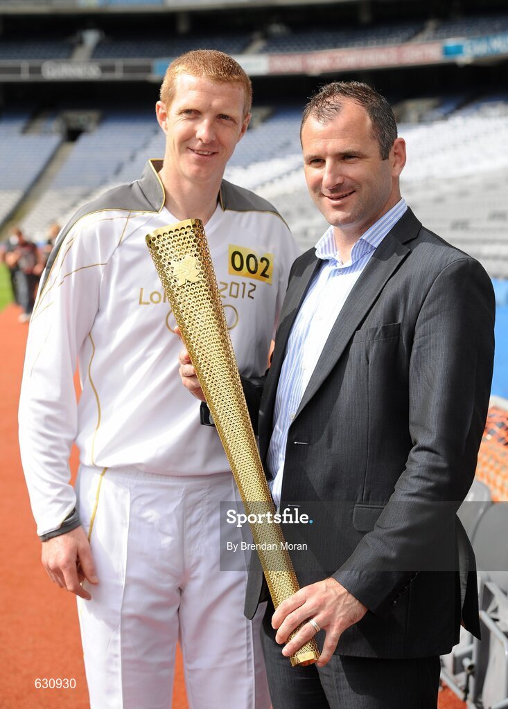 6 June 2012; Kilkenny hurler and 10 time hurling All-Star Henry Shefflin and former Armagh footballer Steven McDonnell with the Olympic Torch during the 2012 Olympic Torch Relay through the streets of Dublin. Croke Park, Dublin. Picture credit: Brendan Moran / SPORTSFILE