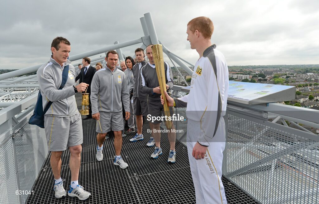 6 June 2012; The Olympic Flame is brought to the torchbearer Henry Shefflin, Kilkenny hurler and 10 time All-Star, on the Etihad Skyline at Croke Park to start the London 2012 Olympic Torch Relay through the streets of Dublin. Croke Park, Dublin. Picture credit: Brendan Moran / SPORTSFILE