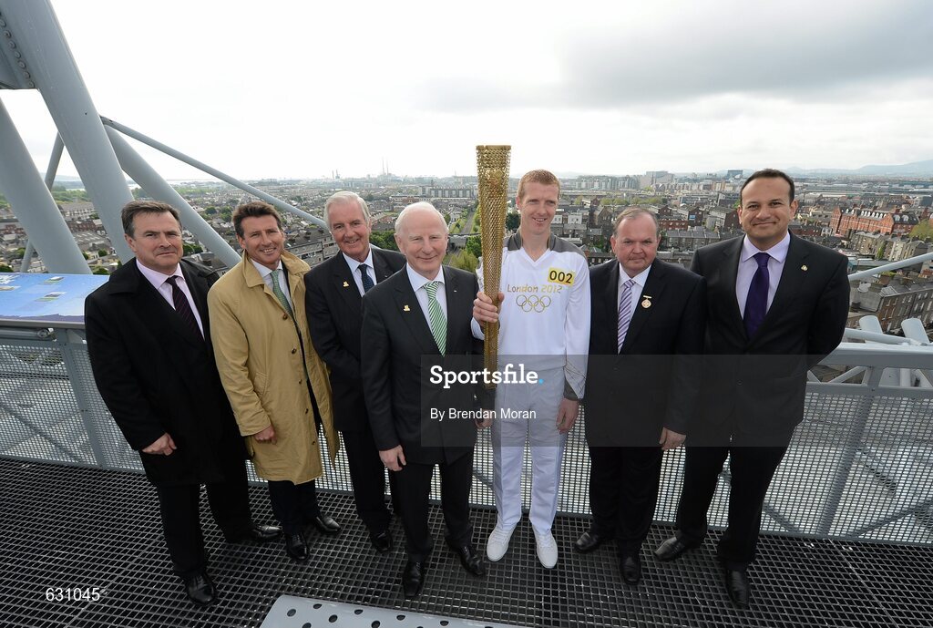 6 June 2012; Kilkenny hurler and 10 time hurling All-Star Henry Shefflin on the Etihad Skyline at Croke Park carrying the Olympic Flame, with from left, Peter McKenna, Stadium Director, Croke Park and Commercial Director of the GAA, Lord Sebastian Coe, Chairman of London 2012 Olympic Games and Paralympic Games, Sir Craig Reedie, Executive Board Member of the International Olympic Committee, Pat Hickey, President of the Olympic Council of Ireland, Uachtarán Chumann Lúthchleas Gael Liam Ó Néill, and Leo Varadkar, T.D., Minister for Transport, Tourism and Sport, during the London 2012 Olympic Torch Relay through the streets of Dublin. Croke Park, Dublin. Picture credit: Brendan Moran / SPORTSFILE