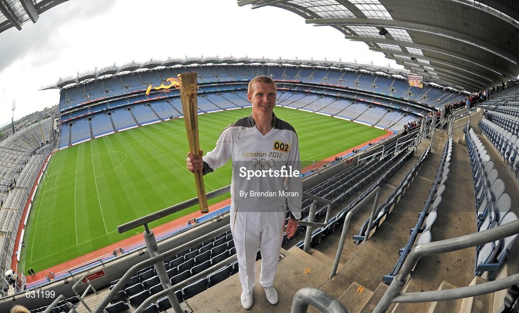 6 June 2012; Kilkenny hurler and 10 time hurling All-Star Henry Shefflin at Croke Park with the Olympic Flame during the London 2012 Olympic Torch Relay through the streets of Dublin. Croke Park, Dublin. Picture credit: Brendan Moran / SPORTSFILE