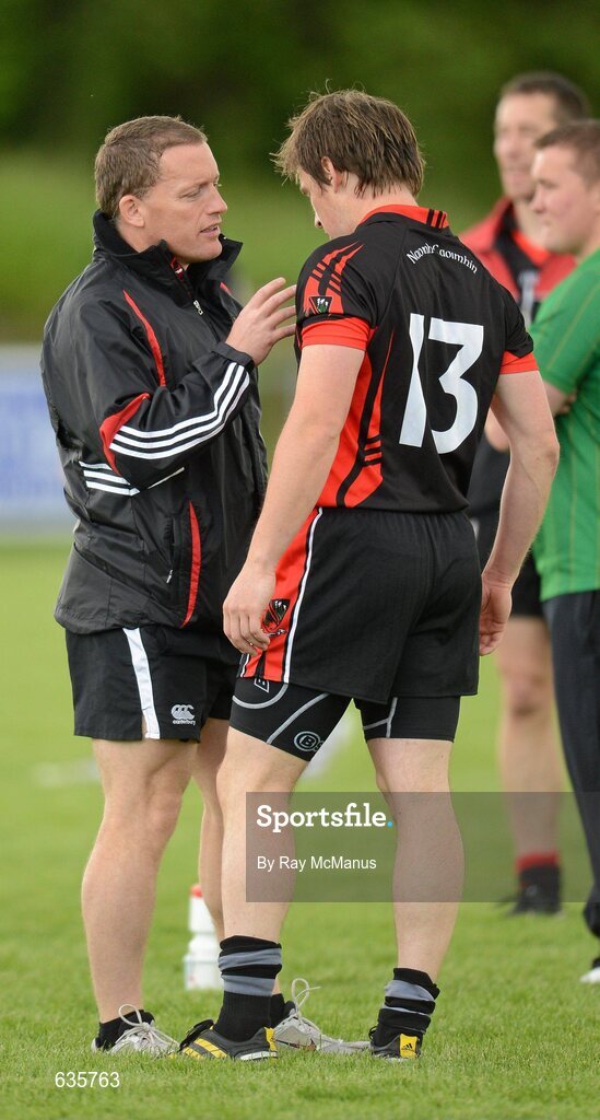 10 June 2012; Seanie Johnston, St. Kevin's GAA Club, Staplestown, North Kildare, who scored five points in a 1 - 11 to 1 - 8 victory, listens to team manager Gordon Ward before the game. Kildare Senior Football League, Division 2, Kilcock GAA Club v St Kevin's GAA Club, Kilcock GAA Club, Baltracey, Kilcock, Co. Kildare. Picture credit: Ray McManus / SPORTSFILE