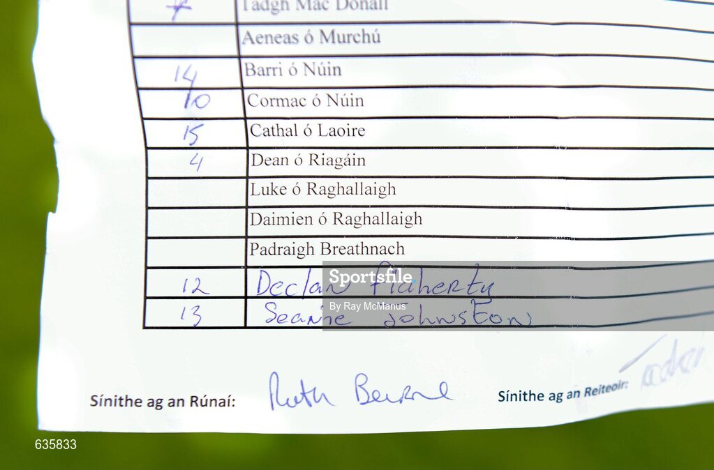 10 June 2012; A section of the team sheet showing the number 13 as Seanie Johnston. He scored five points in a 1 - 11 to 1 - 8 victory over Kilcock GAA Club. Kildare Senior Football League, Division 2, Kilcock GAA Club v St Kevin's GAA Club, Kilcock GAA Club, Baltracey, Kilcock, Co. Kildare. Picture credit: Ray McManus / SPORTSFILE