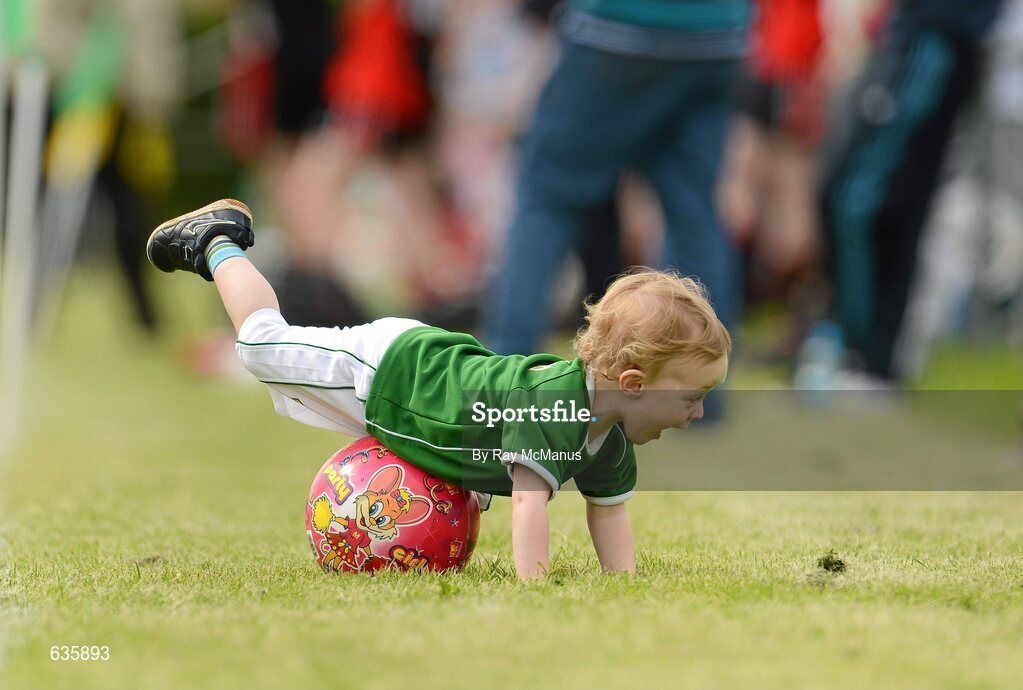 10 June 2012; Sixteen month old Callum Dunne, whose dad lined out at midfield for St Kevin's, entertains supporters on the sideline. Kildare Senior Football League, Division 2, Kilcock GAA Club v St Kevin's GAA Club, Kilcock GAA Club, Baltracey, Kilcock, Co. Kildare. Picture credit: Ray McManus / SPORTSFILE