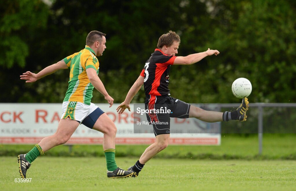 10 June 2012; Seanie Johnston, St. Kevin's GAA Club, Staplestown, North Kildare, who scored five points in a 1 - 11 to 1 - 8 victory, in action against Dean Regan, Kilcock GAA Club. Kildare Senior Football League, Division 2, Kilcock GAA Club v St Kevin's GAA Club, Kilcock GAA Club, Baltracey, Kilcock, Co. Kildare. Picture credit: Ray McManus / SPORTSFILE