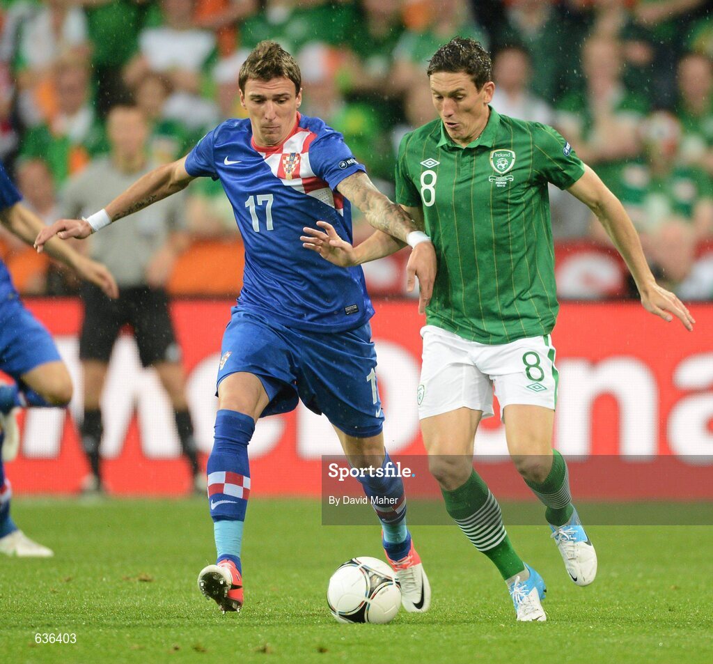 10 June 2012; Keith Andrews, Republic of Ireland, in action against Mario Mandžukic, Croatia. EURO2012, Group C, Republic of Ireland v Croatia, Municipal Stadium Poznan, Poznan, Poland. Picture credit: David Maher / SPORTSFILE