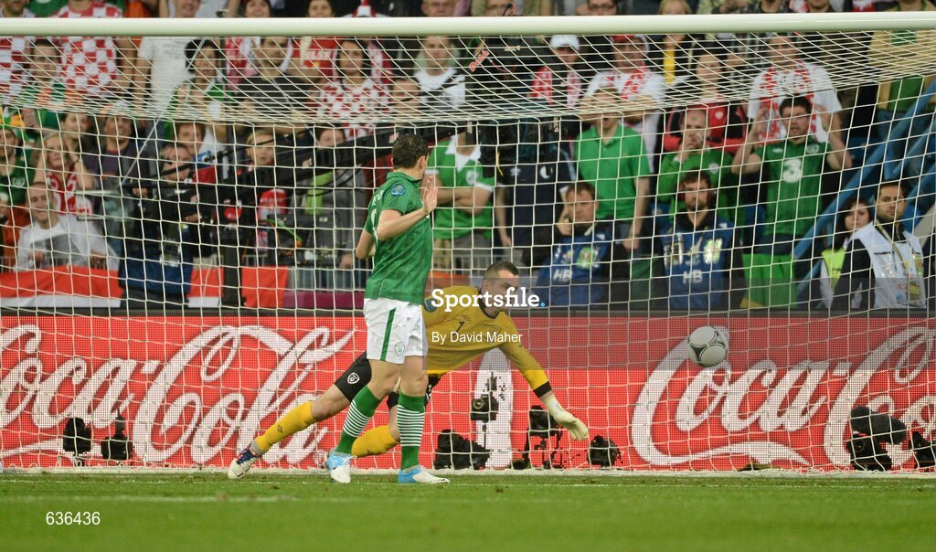 10 June 2012; Republic of Ireland goalkeeper Shay Given is beaten by a header from Croatia's Mario Mandžukic, to concede his side's first goal of the game. EURO2012, Group C, Republic of Ireland v Croatia, Municipal Stadium Poznan, Poznan, Poland. Picture credit: David Maher / SPORTSFILE