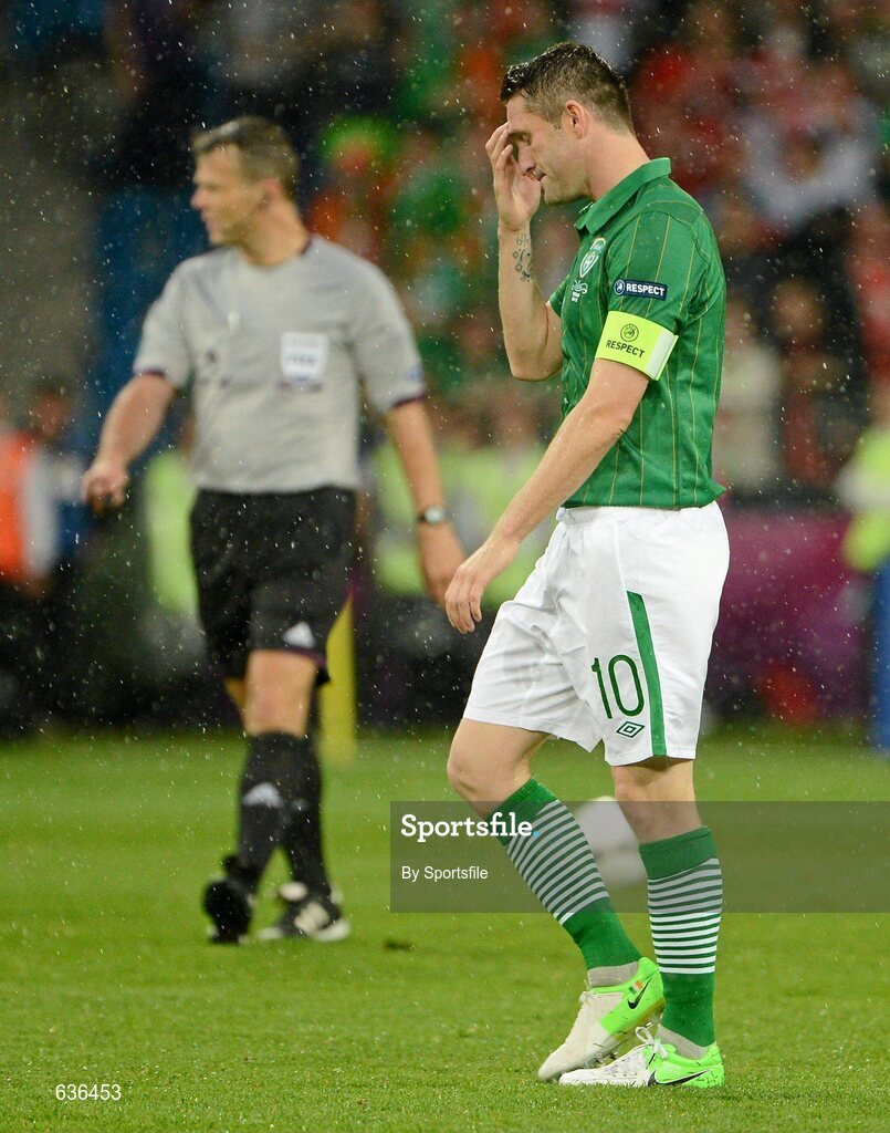 10 June 2012; Robbie Keane, Republic of Ireland, shows his disappointment after Mario Mandžukic, Croatia, scored their side's first goal after three minutes. EURO2012, Group C, Republic of Ireland v Croatia, Municipal Stadium Poznan, Poznan, Poland. Photo by Sportsfile