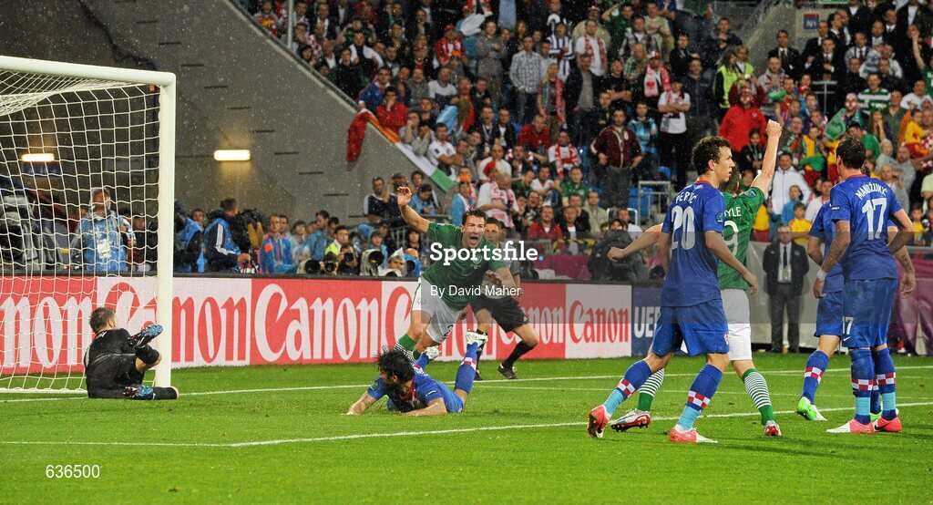 10 June 2012; Sean St. Ledger, Republic of Ireland, turns to celebrate after scoring his side's equalising goal after 19 minutes. EURO2012, Group C, Republic of Ireland v Croatia, Municipal Stadium Poznan, Poznan, Poland. Picture credit: David Maher / SPORTSFILE