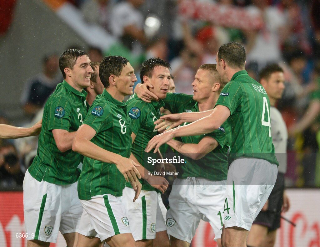 10 June 2012; Republic of Ireland's Sean St. Ledger, centre, celebrates with team-mates, from left to right, Stephen Ward, Keith Andrews, Damien Duff and John O'Shea, after scoring his side's equalising goal after 19 minutes. EURO2012, Group C, Republic of Ireland v Croatia, Municipal Stadium Poznan, Poznan, Poland. Picture credit: David Maher / SPORTSFILE