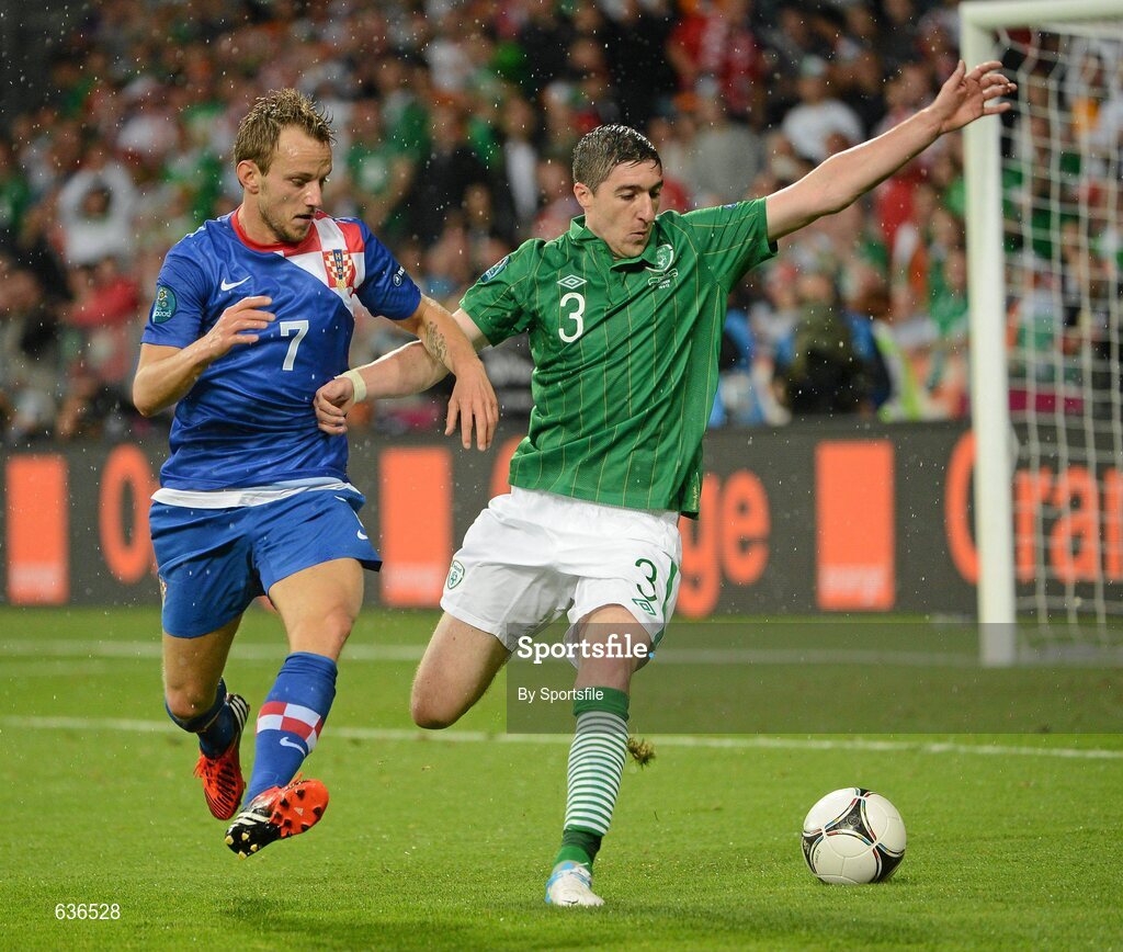10 June 2012; Stephen Ward, Republic of Ireland, in action against Ivan Rakitic, Croatia. EURO2012, Group C, Republic of Ireland v Croatia, Municipal Stadium Poznan, Poznan, Poland. Photo by Sportsfile