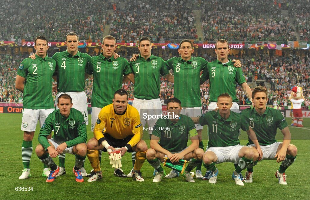 10 June 2012; The Republic of Ireland team, back row, from left top right, Sean St. Ledger, John O'Shea, Richard Dunne, Stephen Ward, Keith Andrews and Glenn Whelan. Front row, from left to right, Aiden McGeady, Shay Given, Robbie Keane, Damien Duff and Kevin Doyle. EURO2012, Group C, Republic of Ireland v Croatia, Municipal Stadium Poznan, Poznan, Poland. Picture credit: David Maher / SPORTSFILE