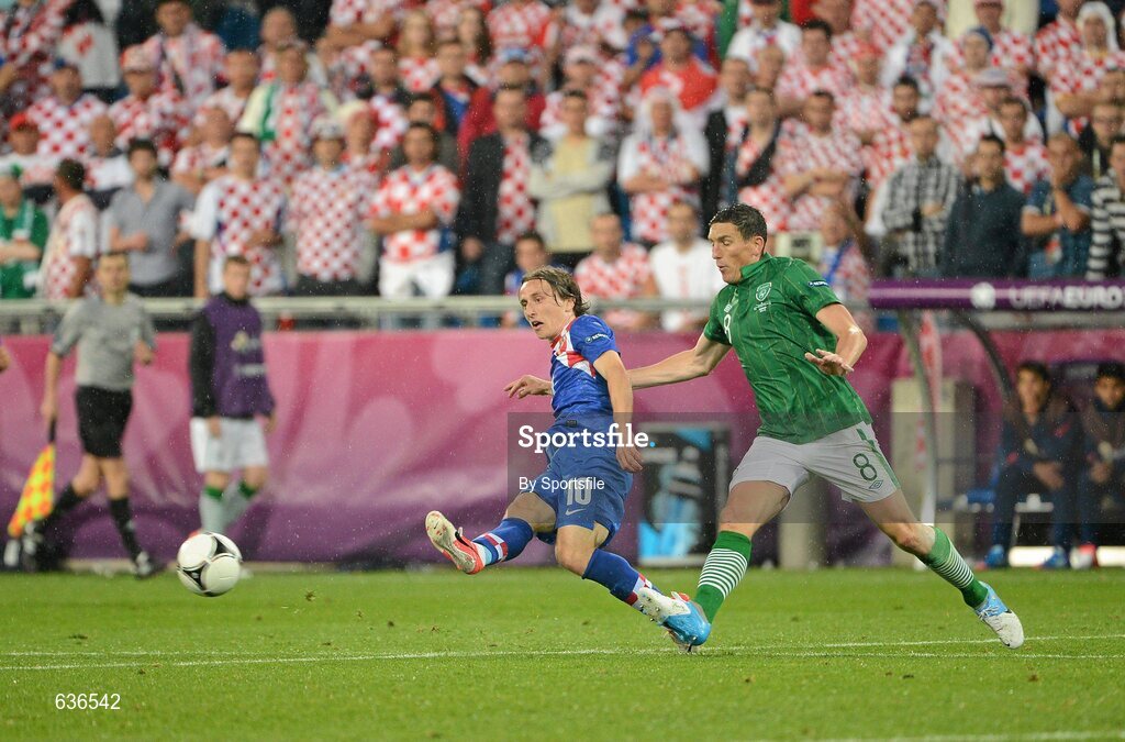 10 June 2012; Luka Modric, Croatia, in action against Keith Andrews, Republic of Ireland. EURO2012, Group C, Republic of Ireland v Croatia, Municipal Stadium Poznan, Poznan, Poland. Photo by Sportsfile