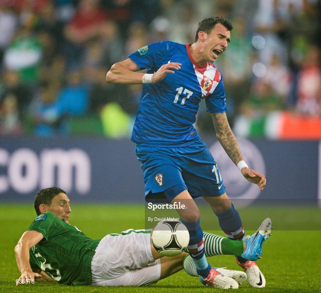 10 June 2012; Mario Mandžukic, Croatia, is tackled by Keith Andrews, Republic of Ireland. EURO2012, Group C, Republic of Ireland v Croatia, Municipal Stadium Poznan, Poznan, Poland. Picture credit: David Maher / SPORTSFILE