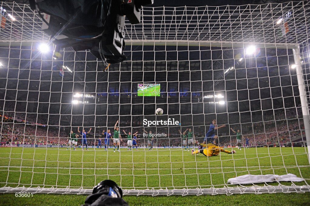 10 June 2012; Croatia's Nikica Jelavic shoots past Republic of Ireland goalkeeper Shay Given to score his side's second goal after 43 minutes. EURO2012, Group C, Republic of Ireland v Croatia, Municipal Stadium Poznan, Poznan, Poland. Photo by Sportsfile