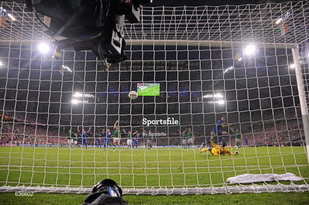 10 June 2012; Croatia's Nikica Jelavic shoots past Republic of Ireland goalkeeper Shay Given to score his side's second goal after 43 minutes. EURO2012, Group C, Republic of Ireland v Croatia, Municipal Stadium Poznan, Poznan, Poland. Photo by Sportsfile
