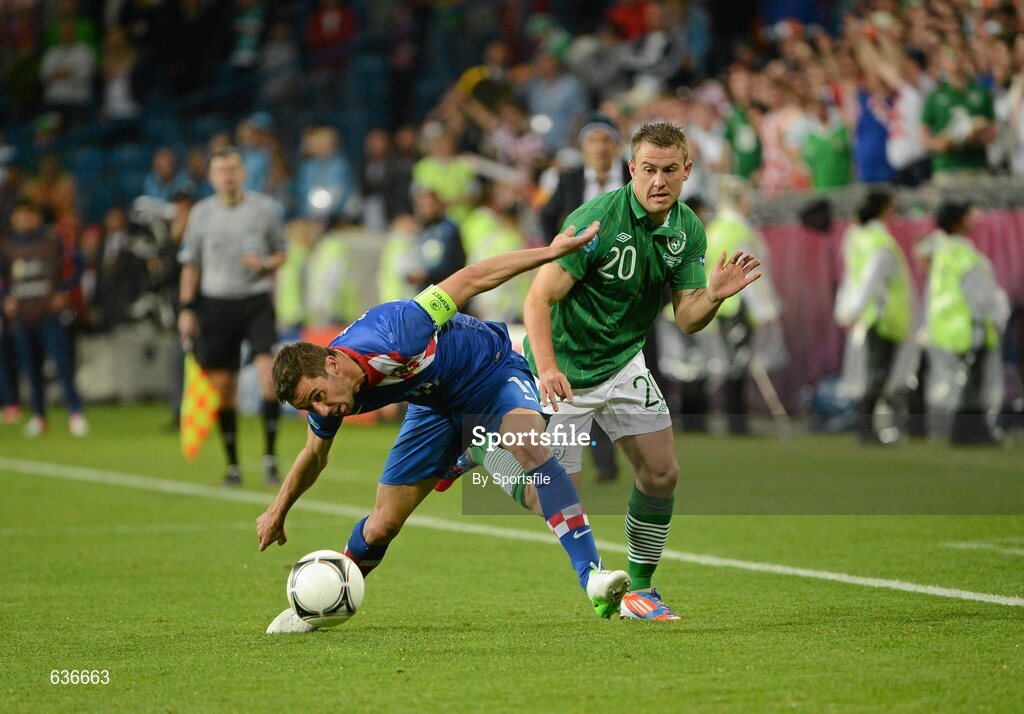 10 June 2012; Darijo Srna, Croatia, in action against Simon Cox, Republic of Ireland. EURO2012, Group C, Republic of Ireland v Croatia, Municipal Stadium Poznan, Poznan, Poland. Photo by Sportsfile