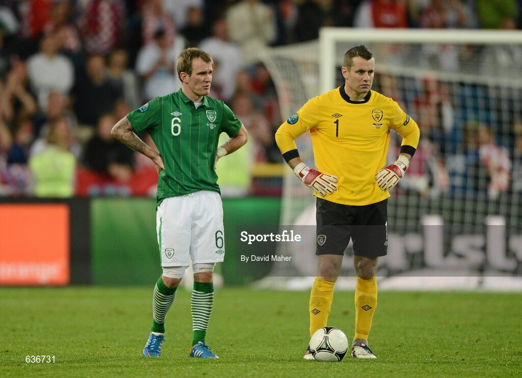 10 June 2012; Republic of Ireland goalkeeper Shay Given, right, and Glenn Whelan during the final minutes of the game. EURO2012, Group C, Republic of Ireland v Croatia, Municipal Stadium Poznan, Poznan, Poland. Picture credit: David Maher / SPORTSFILE