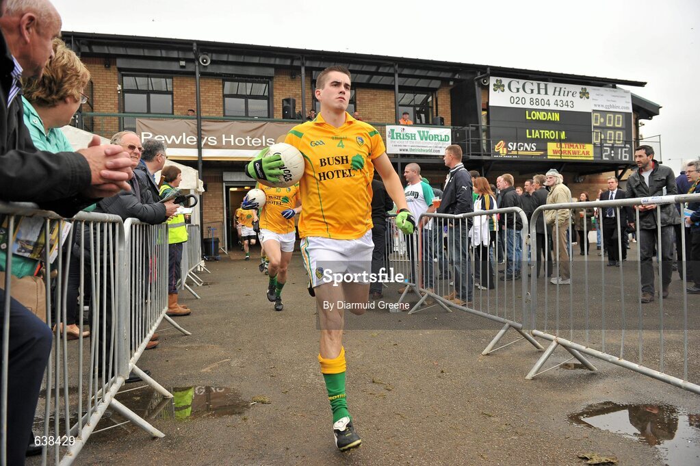 3 June 2012; Leitrim captain Paddy Maguire leads his team out onto the pitch for the start of the game. Connacht GAA Football Senior Championship Quarter-Final, London v Leitrim, Emerald Park, Ruislip, London. Picture credit: Diarmuid Greene / SPORTSFILE