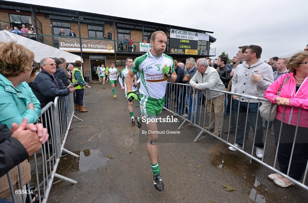 3 June 2012; London captain Sean McVeigh leads his team out onto the pitch for the start of the game. Connacht GAA Football Senior Championship Quarter-Final, London v Leitrim, Emerald Park, Ruislip, London. Picture credit: Diarmuid Greene / SPORTSFILE