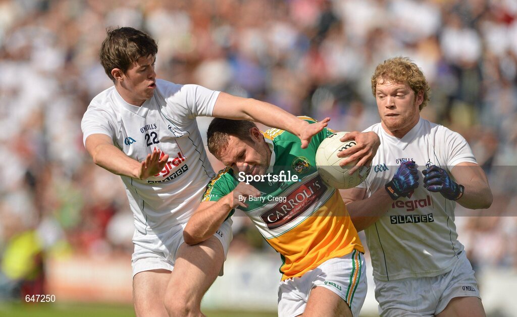 17 June 2012; Shane Sullivan, Offaly, in action against Padraig Fogarty, left, and Tomás O'Connor, Kildare. Leinster GAA Football Senior Championship Quarter-Final, Offaly v Kildare, O'Moore Park, Portlaoise, Co. Laois. Picture credit: Barry Cregg / SPORTSFILE