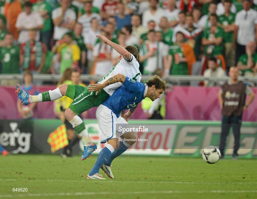 18 June 2012; Alessandro Diamanti, Italy, in action against Glenn Whelan, Republic of Ireland. EURO2012, Group C, Republic of Ireland v Italy, Municipal Stadium Poznan, Poznan, Poland. Picture credit: Brendan Moran / SPORTSFILE