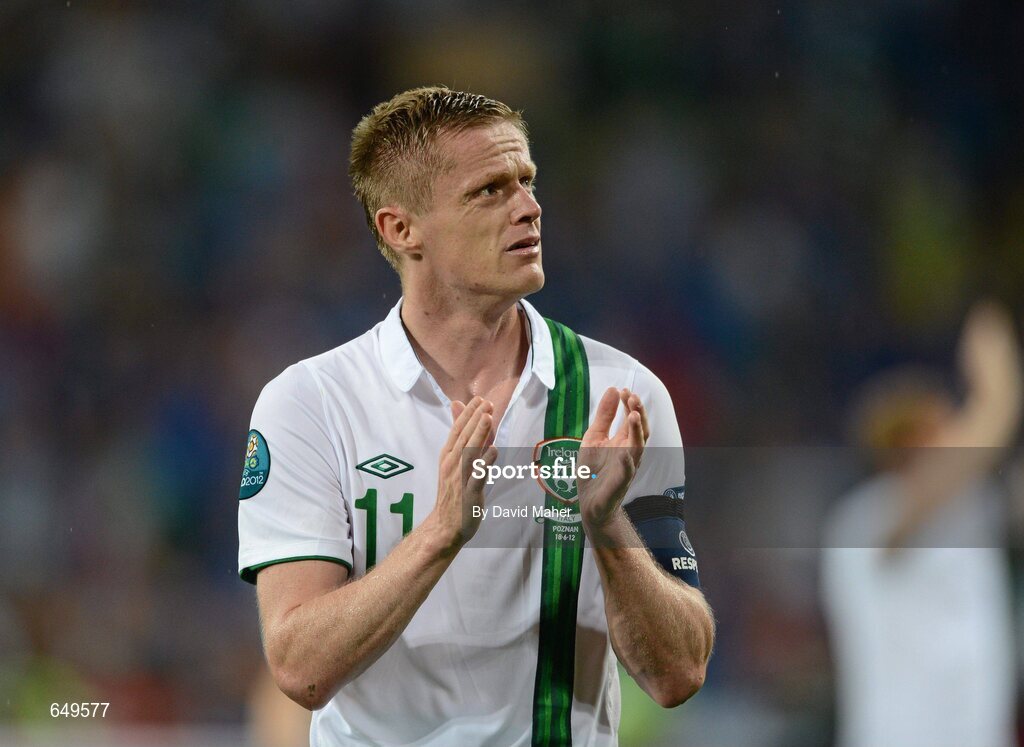 18 June 2012; A dejected Republic of Ireland captain Damien Duff applauds the crowd after the game. EURO2012, Group C, Republic of Ireland v Italy, Municipal Stadium Poznan, Poznan, Poland. Picture credit: David Maher / SPORTSFILE