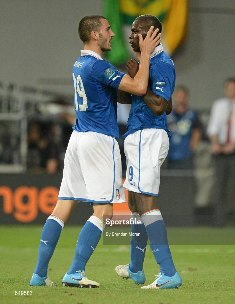 18 June 2012; Mario Balotelli, Italy, celebrates after scoring his side's second goal with team mate Leonardo Bonucci, left. EURO2012, Group C, Republic of Ireland v Italy, Municipal Stadium Poznan, Poznan, Poland. Picture credit: Brendan Moran / SPORTSFILE