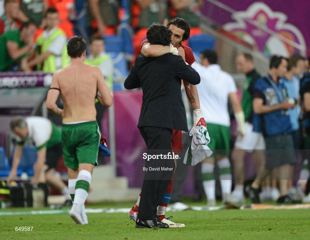 18 June 2012; Gianluigi Buffon, Italy, is congratulated by manager Cesare Prandelli at the end of the game. EURO2012, Group C, Republic of Ireland v Italy, Municipal Stadium Poznan, Poznan, Poland. Picture credit: David Maher / SPORTSFILE