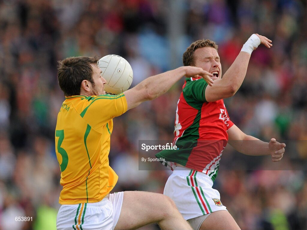 24 June 2012; Andy Moran, Mayo, in action against Fabian McMorrow, Leitrim. Connacht GAA Football Senior Championship Semi-Final, Mayo v Leitrim, McHale Park, Castlebar, Co. Mayo. Photo by Sportsfile
