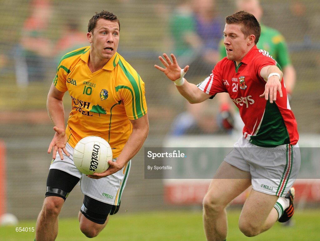 24 June 2012; Paul Brennan, Leitrim, in action against Enda Varley, Mayo. Connacht GAA Football Senior Championship Semi-Final, Mayo v Leitrim, McHale Park, Castlebar, Co. Mayo. Photo by Sportsfile