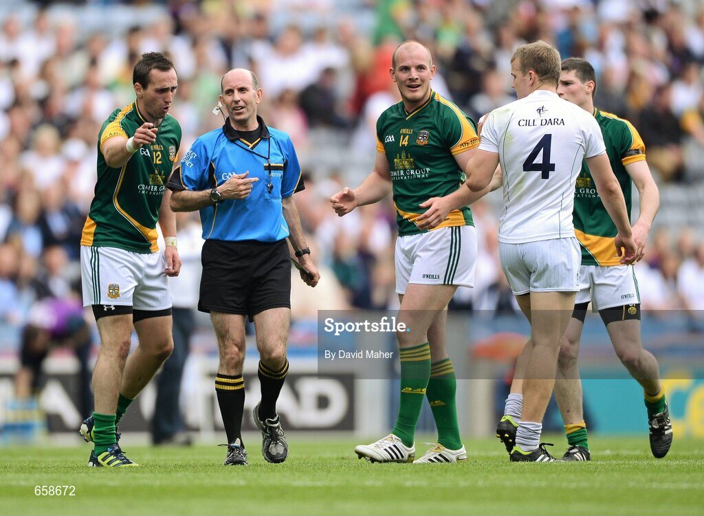 1 July 2012; Referee Michael Collins signals the end of the first half as Graham Reilly, left, and Joe Sheridan, Meath, remonstrate. Leinster GAA Football Senior Championship Semi-Final, Meath v Kildare, Croke Park, Dublin. Picture credit: David Maher / SPORTSFILE