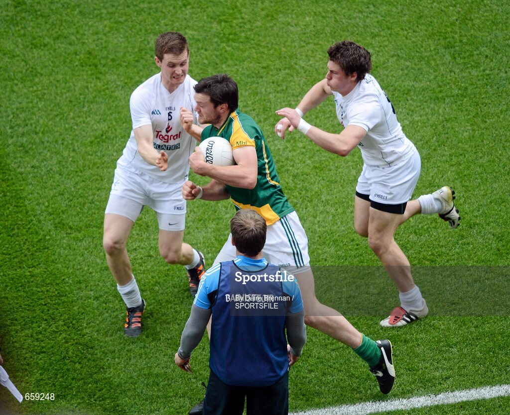 1 July 2012; Brian Meade, Meath, in action against Eoghan O'Flaherty, left, and Emmet Bolton, Kildare, under the eye of Kildare manager Kieran McGeeney. Leinster GAA Football Senior Championship Semi-Final, Meath v Kildare, Croke Park, Dublin. Picture credit: Daire Brennan / SPORTSFILE