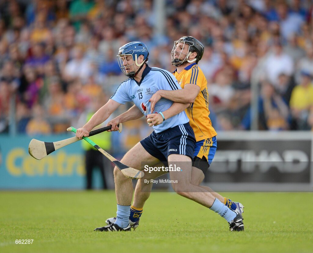 7 July 2012; Paul Ryan, Dublin, in action against Domhnall O'Donovan, Clare. GAA Hurling All-Ireland Senior Championship, Phase 2, Clare v Dublin, Cusack Park, Ennis, Co. Clare. Picture credit: Ray McManus / SPORTSFILE