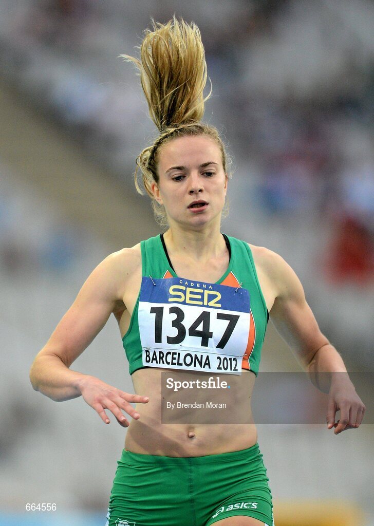12 July 2012; Ireland's Joanna Mills crosses the line in her semi-final of the Women's 400m where she finished 8th in a time of 54.52sec. IAAF World Junior Athletics Championships, Olympic Stadium, Barcelona, Spain. Picture credit: Brendan Moran / SPORTSFILE