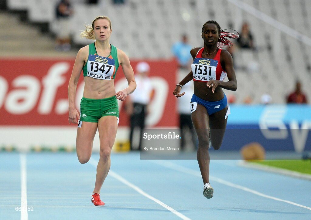 12 July 2012; Ireland's Joanna Mills in action alongside Grace Claxton, right, Puerto Rico, during her semi-final of the Women's 400m where she finished 8th in a time of 54.52sec. IAAF World Junior Athletics Championships, Olympic Stadium, Barcelona, Spain. Picture credit: Brendan Moran / SPORTSFILE
