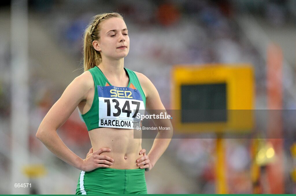 12 July 2012; Ireland's Joanna Mills prepares herself before her semi-final of the Women's 400m where she finished 8th in a time of 54.52sec. IAAF World Junior Athletics Championships, Olympic Stadium, Barcelona, Spain. Picture credit: Brendan Moran / SPORTSFILE