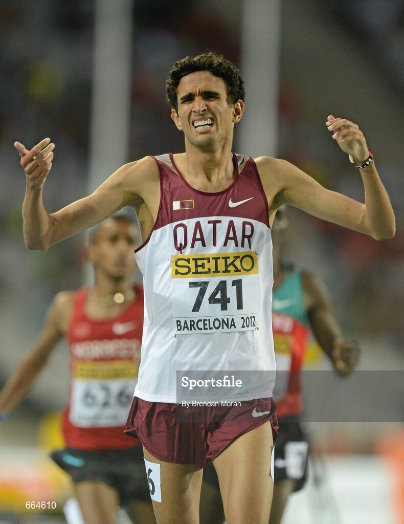 12 July 2012; Hamza Driouch, Qatar, celebrates winning the Men's 1500m Final. IAAF World Junior Athletics Championships, Olympic Stadium, Barcelona, Spain. Picture credit: Brendan Moran / SPORTSFILE