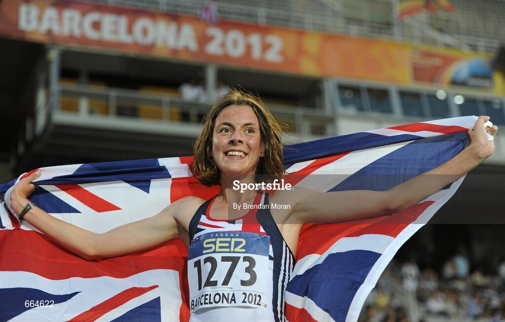 12 July 2012; Jessica Judd, Great Britain, celebrates winning silver in the Women's 800m Final. IAAF World Junior Athletics Championships, Olympic Stadium, Barcelona, Spain. Picture credit: Brendan Moran / SPORTSFILE