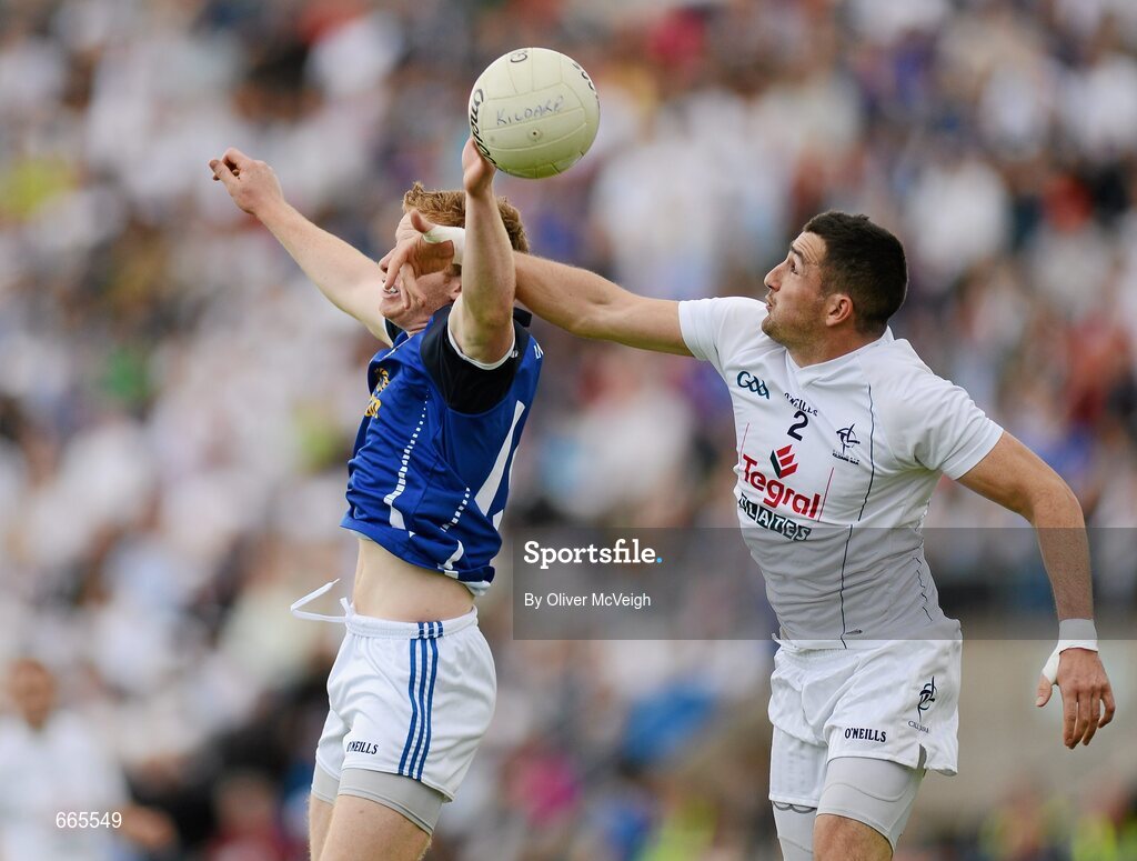 15 July 2012; Aindriu MacLochlainn, Kildare, in action against Jack Brady, Cavan. GAA Football All-Ireland Senior Championship Qualifier, Round 2, Cavan v Kildare, Kingspan Breffni Park, Cavan. Picture credit: Oliver McVeigh / SPORTSFILE