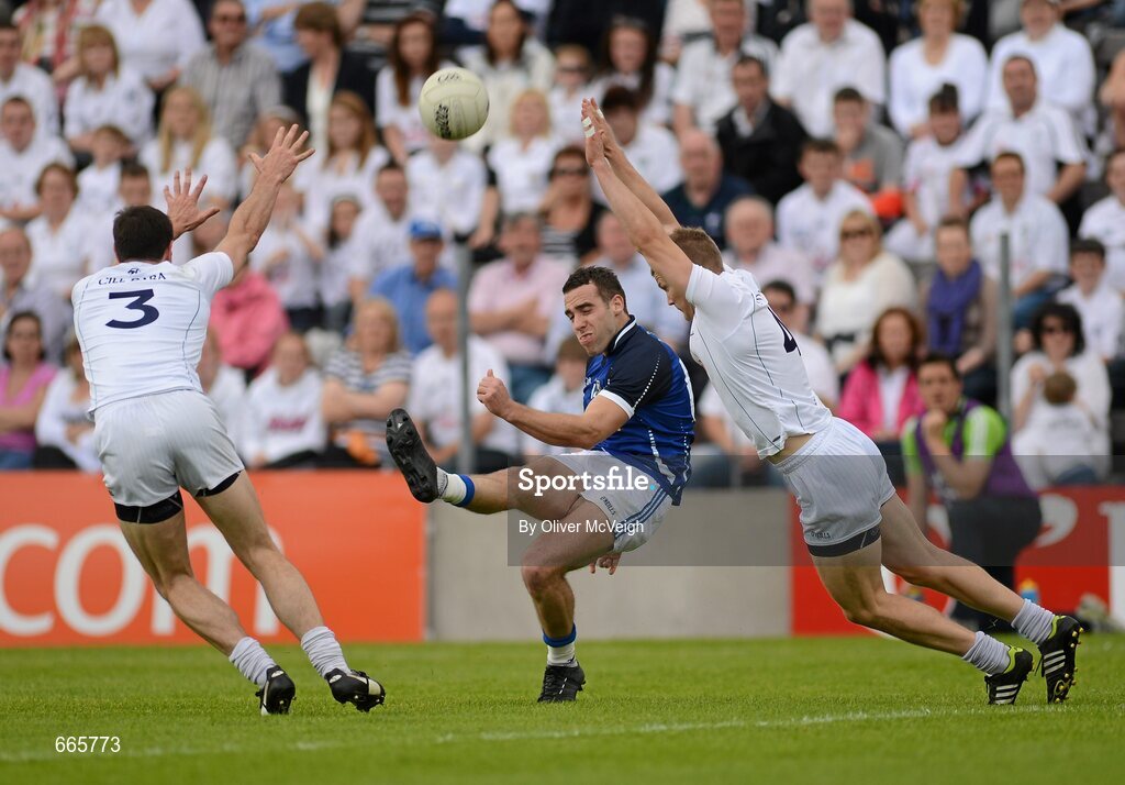 15 July 2012; Eugene Keating, Cavan, in action against Michael Foley and Peter Kelly, Kildare. GAA Football All-Ireland Senior Championship Qualifier, Round 2, Cavan v Kildare, Kingspan Breffni Park, Cavan. Picture credit: Oliver McVeigh / SPORTSFILE