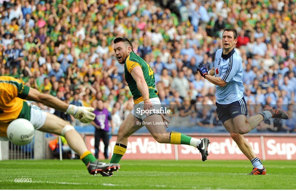 22 July 2012; Denis Bastick, Dublin, and Micky Burke, Meath, watch Bastic's shot go past Meat goalkeeper David Gallagher for Dublin's second goal. Leinster GAA Football Senior Championship Final, Dublin v Meath, Croke Park, Dublin. Picture credit: Brian Lawless / SPORTSFILE