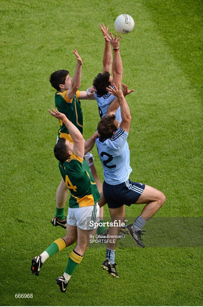 22 July 2012; Eamon Fennell, top, and Bryan Cullen, Dublin, in action against Brian Meade, top, and Micky Burke, Meath. Leinster GAA Football Senior Championship Final, Dublin v Meath, Croke Park, Dublin. Picture credit: Dáire Brennan / SPORTSFILE