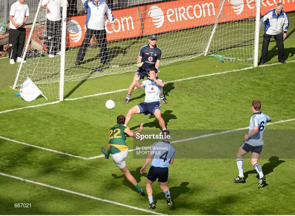 22 July 2012; Jamie Queeney, Meath, scores his side's first goal, despite the efforts of Dublin full-back Rory O'Carroll, and goalkeeper Stephen Cluxton. Leinster GAA Football Senior Championship Final, Dublin v Meath, Croke Park, Dublin. Picture credit: Dáire Brennan / SPORTSFILE