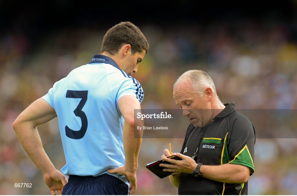 22 July 2012; Referee Marty Duffy takes the name of Rory O'Carroll, Dublin. Leinster GAA Football Senior Championship Final, Dublin v Meath, Croke Park, Dublin. Picture credit: Brian Lawless / SPORTSFILE
