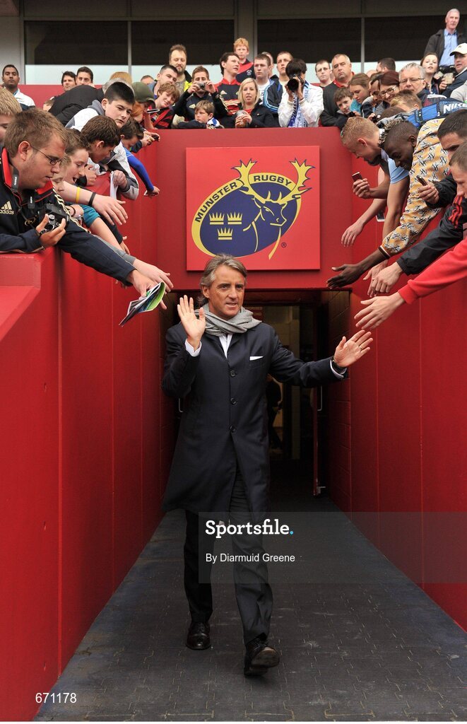 5 August 2012; Manchester City manager Roberto Mancini is greeted by supporters before the game. Soccer Friendly, Limerick FC v Manchester City, Thomond Park, Limerick. Picture credit: Diarmuid Greene / SPORTSFILE