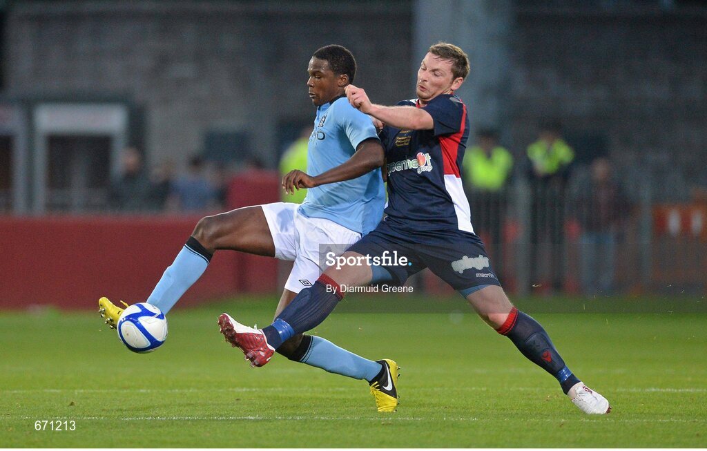 5 August 2012; Dedryck Boyata, Manchester City, in action against Denis Behan, Limerick FC. Soccer Friendly, Limerick FC v Manchester City, Thomond Park, Limerick. Picture credit: Diarmuid Greene / SPORTSFILE