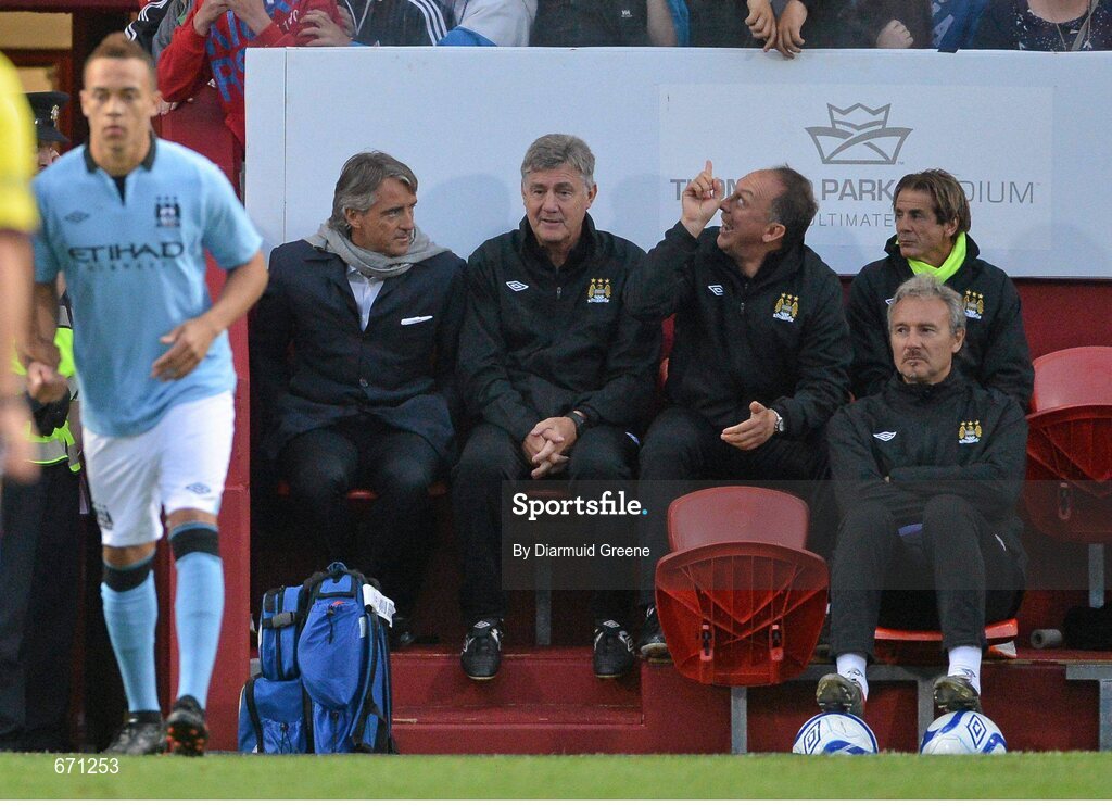 5 August 2012; Manchester City manager Roberto Mancini, left, with his assistant coaches Brian Kidd, centre, and David Platt, during the game. Soccer Friendly, Limerick FC v Manchester City, Thomond Park, Limerick. Picture credit: Diarmuid Greene / SPORTSFILE