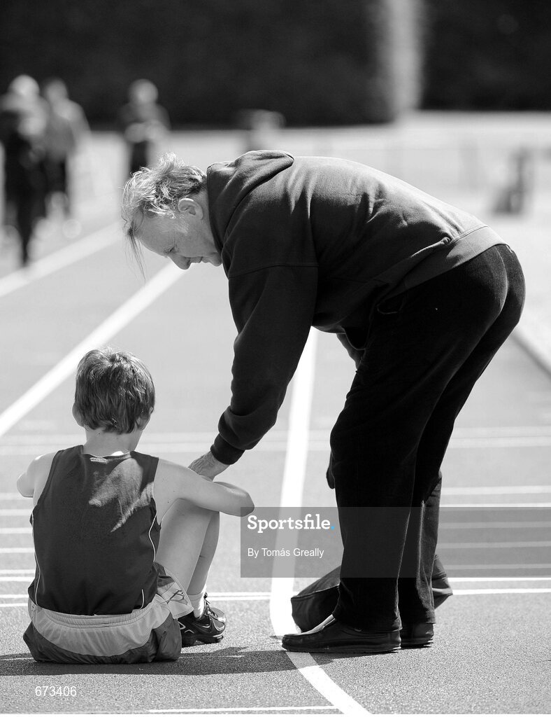 28 July 2012; Dylan Kearns, Killybegs A.C., Co. Donegal, and his grandfather and coach Bernie O'Callaghan, after competing in the Boy's Under-14 2,000m Walk event. Woodie’s DIY Juvenile Track and Field Championships of Ireland, Tullamore Harriers Stadium, Tullamore, Co. Offaly. Picture credit: Tomas Greally / SPORTSFILE