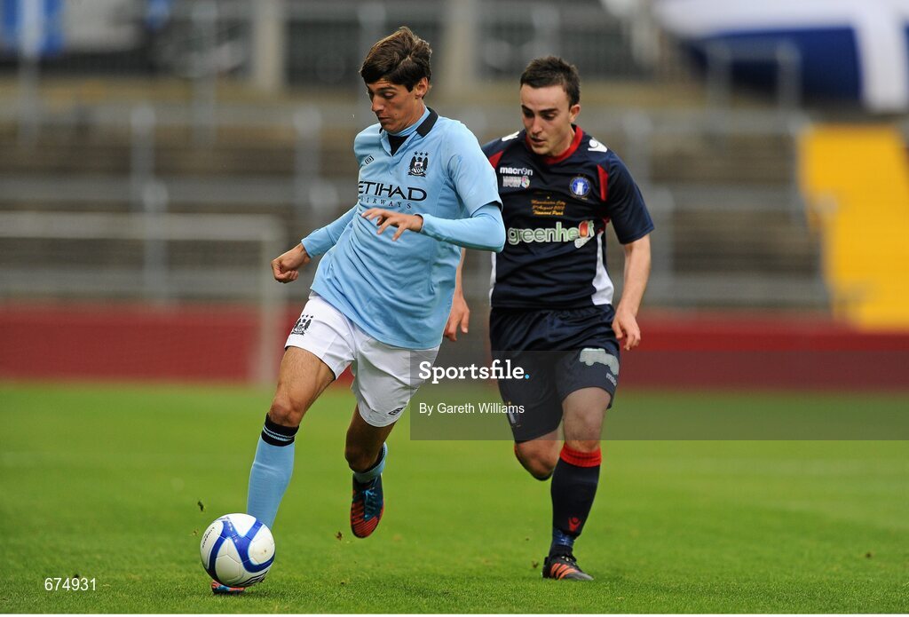 5 August 2012; Luca Scapuzzi, Manchester City, in action against Shane Tracy, Limerick FC. Soccer Friendly, Limerick FC v Manchester City, Thomond Park, Limerick. Picture credit: Gareth Williams / SPORTSFILE